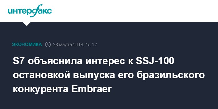 Москва. 28 марта. INTERFAX.RU - Авиакомпания "Сибирь" (летает под брендом S7 Airlines) объяснила интерес к укороченной версии российского регионального самолета Sukhoi Superjet 100 остановкой производства его бразильского конкурента Embraer.