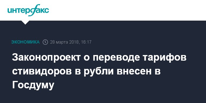В августе 2017 года президент РФ Владимир Путин потребовал от профильных ведомств ускорить решение вопроса о переводе ставок обслуживания стивидорных компаний из долларов в рубли. С соответствующим предложением к президенту на совещании по развитию транспортной инфраструктуры Северо-Запада РФ обратился глава ФАС Игорь Артемьев.