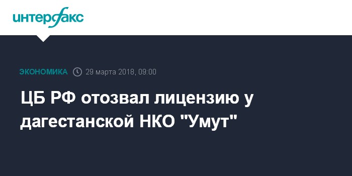 ЦБ РФ отозвал лицензию у дагестанской НКО "Умут"