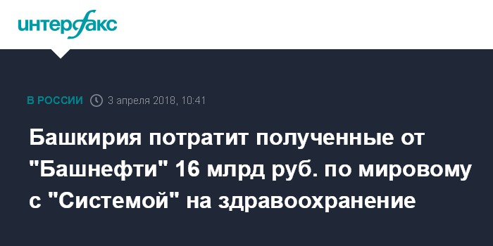 Башкирия потратит полученные от "Башнефти" 16 млрд руб. по мировому с "Системой" на здравоохранение