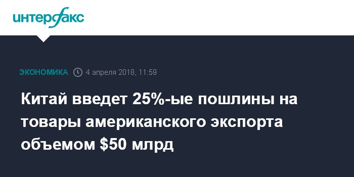 Китай введет 25%-ые пошлины на товары американского экспорта объемом $50 млрд