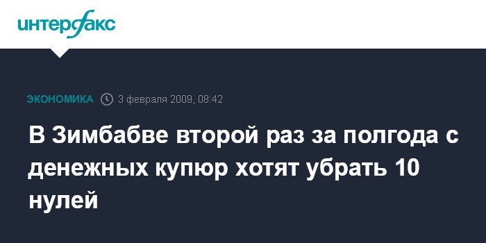 Москва. 3 февраля. INTERFAX.RU - Правительство Зимбабве рассматривает возможность проведения новой деноминации - второй за последние полгода. Ожидается, что с новых зимбабвийских долларов будут убраны 10 нулей.