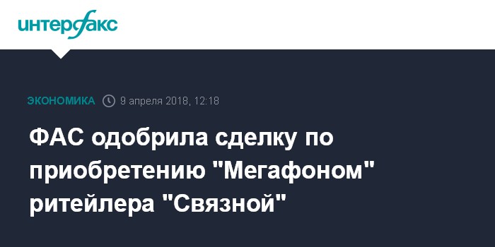 Москва. 9 апреля. INTERFAX.RU - Федеральная антимонопольная служба (ФАС) России удовлетворила ходатайство ПАО "Мегафон" о покупке АО "Связной Логистика" и входящего в группу "Связной" ООО "Мобильный Телекоммуникационный Сервис", говорится в сообщении ведомства.