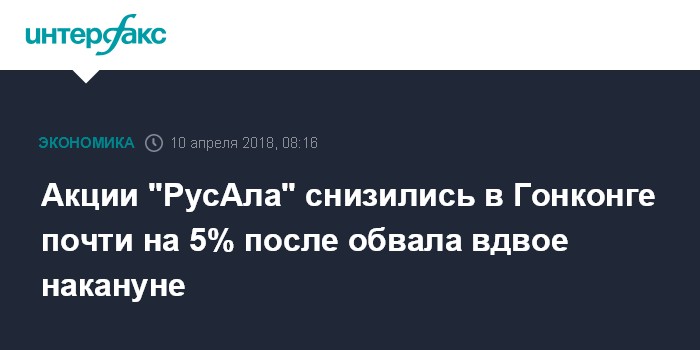 Москва. 10 апреля. INTERFAX.RU - Акции "РусАл" снижаются на бирже в Гонконге во вторник почти на 5%, в течение торгов их падение достигало 7% из-за опасений инвесторов по поводу перспектив компании после введения в отношении нее санкций США.