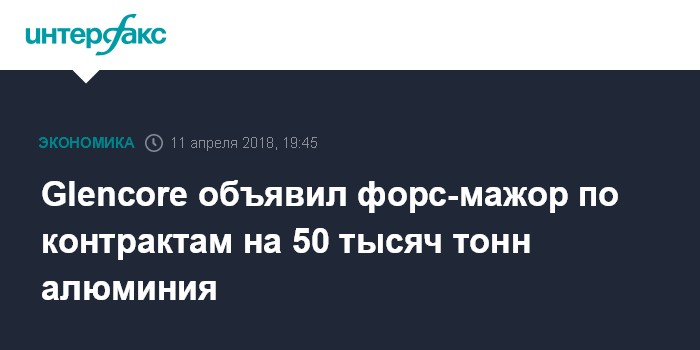 Москва. 11 апреля. INTERFAX.RU - Glencore, акционер и крупнейший покупатель продукции "РусАла", объявил форс-мажор по контрактам на 50 тысяч тонн металла предположительно российского происхождения, сообщает агентство Bloomberg со ссылкой на анонимные источники.
