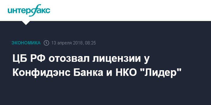 Москва. 13 апреля. INTERFAX.RU - Банк России отозвал лицензии на осуществление банковских операций у Конфидэнс Банка и у небанковской кредитной организации (НКО) "Лидер" (Москва), говорится в сообщении ЦБ.