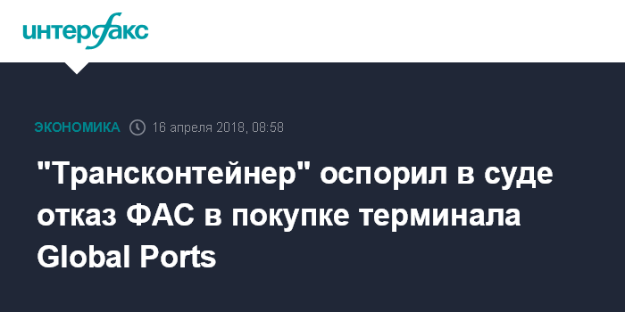 Москва. 16 апреля. INTERFAX.RU - ПАО "Трансконтейнер" подало иск о признании недействительным решения Федеральной антимонопольной службы (ФАС) РФ от 23 октября 2017 года об отказе в удовлетворении ходатайства о покупке терминала Global Ports, следует из картотеки арбитражных дел.
