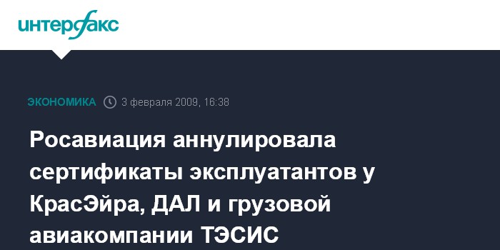 Москва. 3 февраля. INTERFAX.RU - Федеральное агентство воздушного транспорта (Росавиация) аннулировало со вторника сертификаты эксплуатантов у авиакомпаний АО "Красноярские авиалинии" (КрасЭйр), "Домодедовские авиалинии" (ДАЛ), а также грузовой компании "ТЭСИС", сообщили "Интерфаксу" в ведомстве.