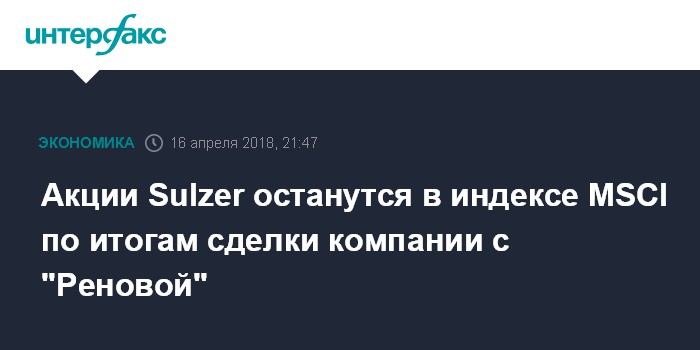 Москва. 16 апреля. INTERFAX.RU - Акции швейцарского машиностроительного концерна Sulzer останутся в индексе MSCI, из которого могли быть исключены после введения американских санкций против "Реновы" Виктора Вексельберга.