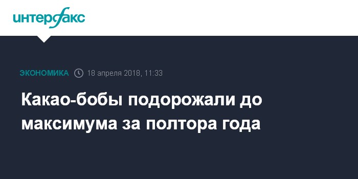 Москва. 18 апреля. INTERFAX.RU - Какао-бобы во вторник подорожали на торгах в Нью-Йорке на 1%, до $2728 за тонну - максимума с октября 2016 года, пишет TradingEconomics. Участники рынка опасаются, что затяжные ливневые дожди могут повредить урожай какао-бобов в Кот-д'Ивуаре - крупнейшем мировом поставщике этого сырья.