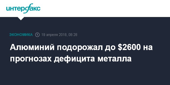 Москва. 19 апреля. INTERFAX.RU - Цена алюминия на Лондонской бирже металлов (LME) подскочила в четверг в ходе торгов на 2,5%, до $2600 за тонну из-за прогнозов в отношении возможного дефицита предложения металла на рынке.