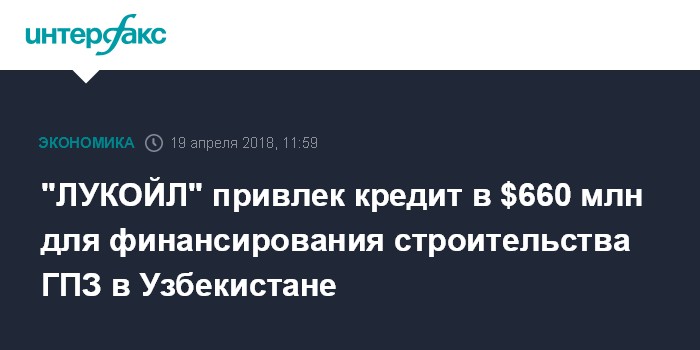 Москва. 19 апреля. INTERFAX.RU - "ЛУКОЙЛ" привлек кредит на финансирование части понесенных затрат по строительству газоперерабатывающего завода на месторождении Кандым в республике Узбекистан на сумму $660 млн со сроком погашения 10 лет, говорится в сообщении компании.