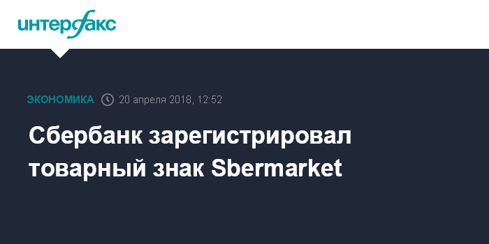 Москва. 20 апреля. INTERFAX.RU - Сбербанк России 6 апреля зарегистрировал товарный знак, состоящий из надписи Sbermarket, следует из данных системы "СПАРК-Интерфакс".
