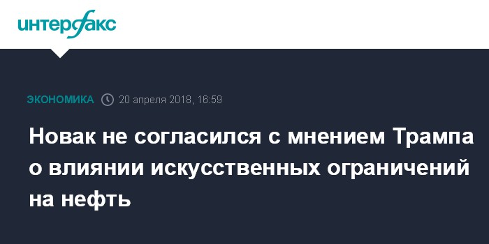 Москва. 20 апреля. INTERFAX.RU - Министр энергетики России Александр Новак полагает, что связывать текущий рост цен с искусственными ограничениями, как заявил президент США Дональд Трамп в своем твиттере, нельзя.