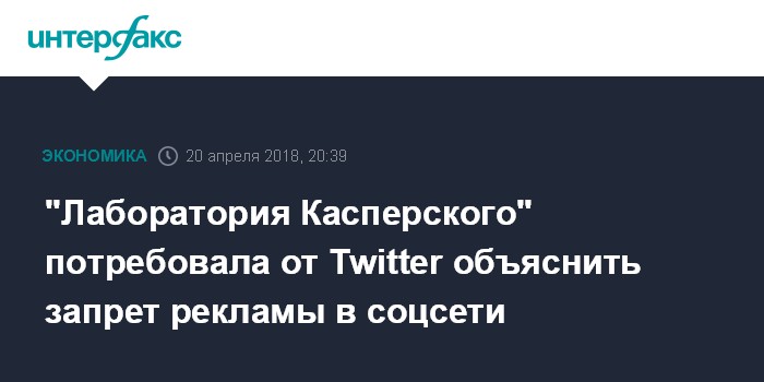 "В конце января Twitter неожиданно уведомил нас о запрете на рекламу с наших официальных аккаунтов, где мы анонсируем посты с наших блогов по кибербезопасности (...) и рассказываем пользователям о новых киберугрозах и методах борьбы с ними. В кратком письме от безымянного сотрудника Twitter сообщалось, что наша компания "работает по бизнес-модели, которая не соответствует стандартам приемлемой рекламы", - говорится в открытом письме главы компании Евгения Касперского руководству Twitter.