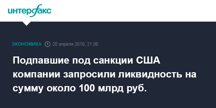 Москва. 20 апреля. INTERFAX.RU - Компании, подпавшие под санкции США, запросили ликвидность на сумму около 100 млрд рублей, сообщил журналистам глава Минфина РФ Антон Силуанов.