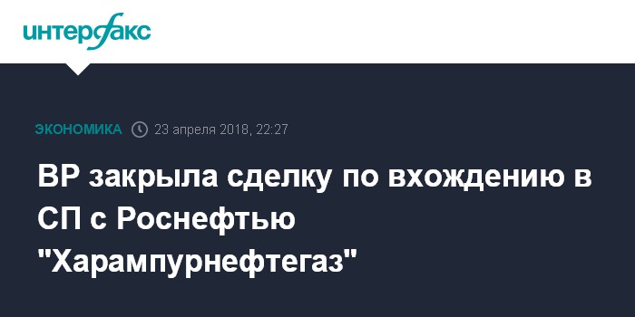 Москва. 23 апреля. INTERFAX.RU - Компания BP (в лице BP Russian Investments Limited) завершила сделку по приобретению 49% долей совместного с "Роснефтью" предприятия ООО "Харампурнефтегаз", свидетельствуют данные системы "СПАРК-Интерфакс".