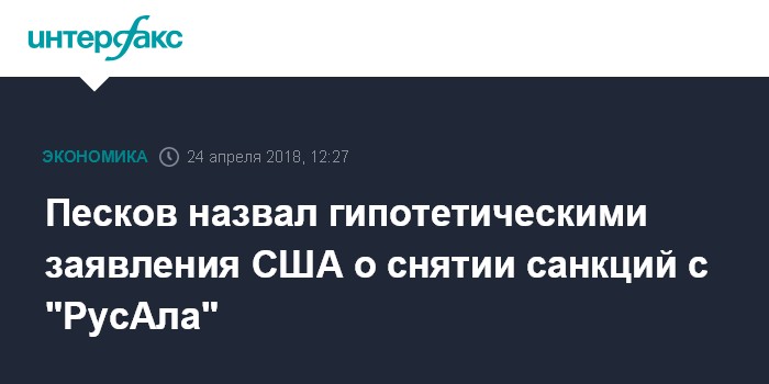 Москва. 24 апреля. INTERFAX.RU - Заявления Вашингтона о возможной отмене санкций против компании "РусАл" при условии отказа основного владельца Олега Дерипаски от контроля над компанией носят гипотетический характер, заявил журналистам пресс-секретарь президента РФ Дмитрий Песков.