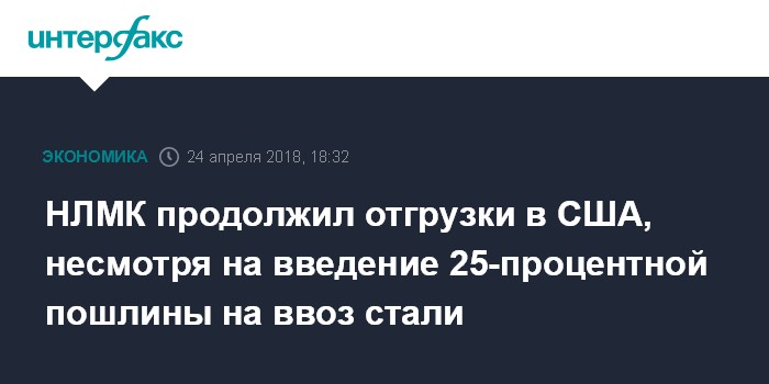 Москва. 24 апреля. INTERFAX.RU - Группа НЛМК продолжает поставки стальной продукции в США, несмотря на введение 25-процентной пошлины на ввоз стали, заявил в ходе телефонной конференции CEO компании Григорий Федоришин.