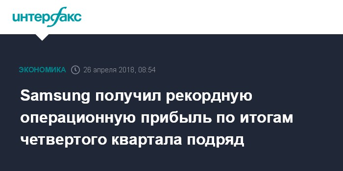 Москва. 26 апреля. INTERFAX.RU - Южнокорейский производитель электроники Samsung Electronics Co увеличил операционную прибыль в первом квартале 2018 года до рекордного показателя, причем компания обновляет рекорд четвертый квартал подряд.