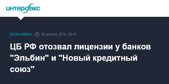 Москва. 26 апреля. INTERFAX.RU - Банк России отозвал лицензии на осуществление банковских операций у банка "Эльбин" (Махачкала) и банка "Новый кредитный союз", говорится в сообщении ЦБ, говорится в сообщении ЦБ.