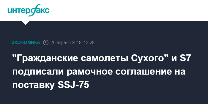Москва. 26 апреля. INTERFAX.RU - АО "Гражданские самолеты Сухого" (ГСС, входит в ПАО "ОАК") и объединяющая авиакомпании "Сибирь" и "Глобус" группа S7 подписали рамочное соглашение на поставку 75-местных самолетов Sukhoi Superjet (SSJ-75). Об этом сообщили "Интерфаксу" в пресс-службе Минпромторга РФ.