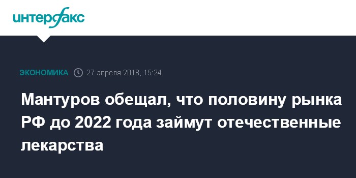 Москва. 27 апреля. INTERFAX.RU - Доля препаратов российского производства на отечественном рынке составит 50% в денежном выражении не позднее 2022 года, заявил министр промышленности и торговли РФ Денис Мантуров.