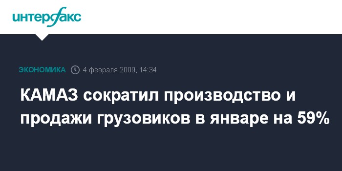 Москва. 4 февраля. INTERFAX.RU – ОАО "КАМАЗ", крупнейший производитель грузовиков в РФ, сократило как производство, так и продажи грузовиков в январе 2009 года к уровню января 2008 года на 59%, сообщил журналистам генеральный директор "КАМАЗа" Сергей Когогин в кулуарах ежегодного форума "Тройки Диалог" (РТС: TROY).