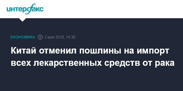 Москва. 2 мая. INTERFAX.RU - Китай с 1 мая отменил пошлины на импорт всех лекарственных средств от рака, включая импортируемые средства китайской традиционной медицины, сообщают в среду официальные китайские СМИ.