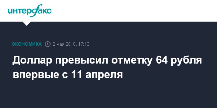 Москва. 2 мая. INTERFAX.RU - Курс доллара США превысил отметку 64 руб./$1 на торгах Московской биржи впервые с 11 апреля на фоне падения нефтяных цен и роста американской валюты на мировом рынке Forex в ожидании итогов майского заседания Федрезерва.