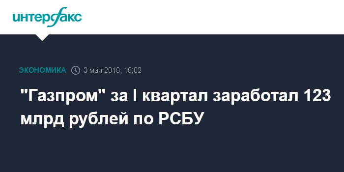 Москва. 3 мая. INTERFAX.RU - Чистая прибыль головной компании ПАО "Газпром" по российским стандартам (РСБУ) в первом квартале 2018 года составила 122,6 млрд рублей, свидетельствуют расчеты "Интерфакса" на основе публичных данных компании.