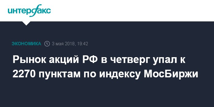 Москва. 3 мая. INTERFAX.RU - Рынок акций РФ к закрытию торгов в четверг скатился в район 2270 пунктов по индексу МосБиржи из-за усилившихся распродаж на фоне негативной динамики мировых фондовых площадок и слабости нефти.