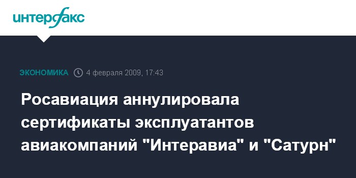 Москва. 4 февраля. INTERFAX.RU - Федеральное агентство воздушного транспорта РФ (Росавиация) аннулировало сертификаты эксплуатантов компаний "Интеравиа" и "Сатурн", сообщил представитель Росавиации журналистам в среду в Москве.