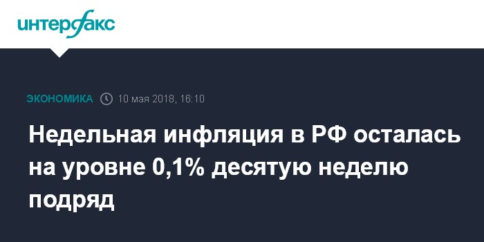 Москва. 10 мая. INTERFAX.RU - Инфляция в России в период с 29 апреля по 7 мая (из-за праздников более длинный период наблюдений, чем неделя) десятую неделю подряд осталась на уровне 0,1%, сообщил в четверг Росстат.