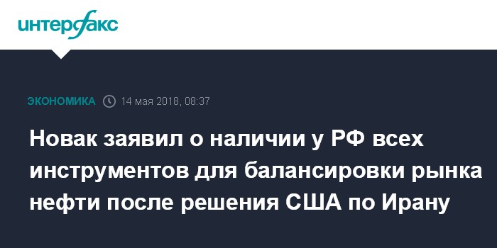 Москва. 14 мая. INTERFAX.RU - У России есть все необходимые инструменты для балансировки ситуации на нефтяном рынке в связи с решением США возобновить санкции в отношении Ирана, заявил исполняющий обязанности главы Минэнерго Александр Новак.