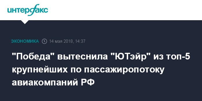 Представитель "Победы" уточнил, что, работая с сентября 2014 года, компания занимала различные позиции в первой десятке крупнейших авиаперевозчиков. Так, по итогам 2015 года "Победа" была седьмой, по итогам 2016 и 2017 гг., а также января, февраля, марта 2018 г. - шестой. Вместе с тем глава авиакомпании Андрей Калмыков говорил ранее, что в 2018 году она войдет в число пяти крупнейших по пассажиропотоку.