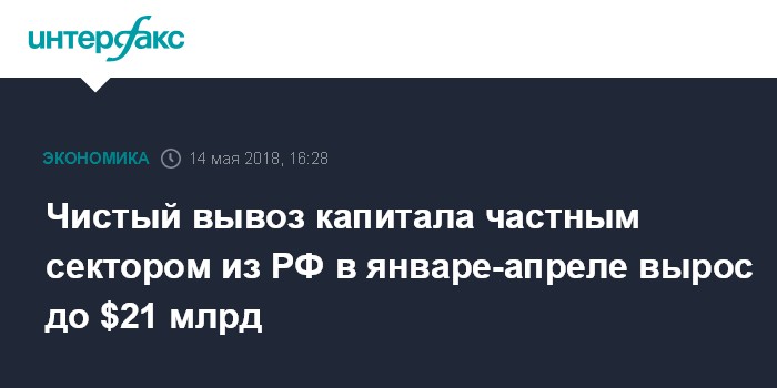 Москва. 14 мая. INTERFAX.RU - Чистый вывоз капитала частным сектором из России в январе-апреле 2018 года, по предварительной оценке, составил $21,0 млрд, что на 17% больше по сравнению с аналогичным периодом 2017 года, когда он равнялся $17,9 млрд, сообщается в информации на сайте ЦБ РФ.