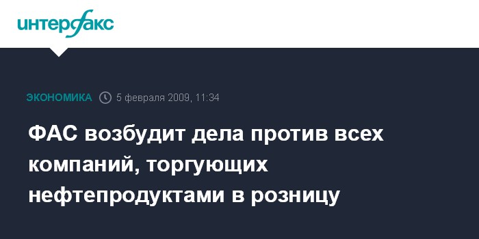 Москва. 5 февраля. INTERFAX.RU - Федеральная антимонопольная служба РФ намерена возбудить дела против всех компаний, занимающихся розничной торговле нефтепродуктами в РФ, так как считает цены искусственно завышенными.