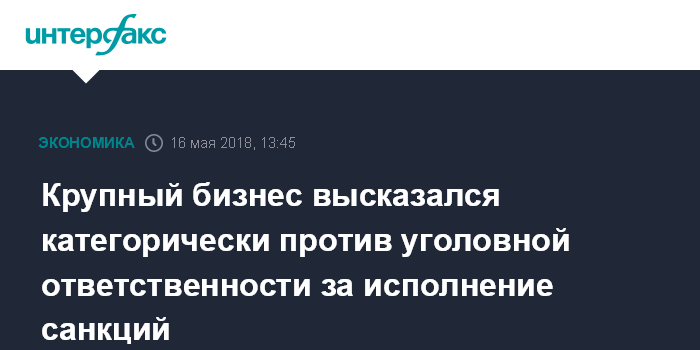 Москва. 16 мая. INTERFAX.RU - Крупный российский бизнес выступил резко против законопроекта "О внесении изменения в Уголовный кодекс РФ", устанавливающего уголовную ответственность за исполнение иностранных санкций.
