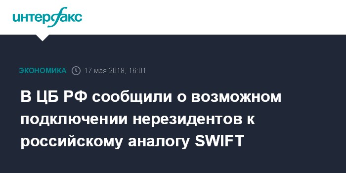 Москва. 17 мая. INTERFAX.RU - Нерезидентам-юрлицам могут разрешить подключаться к Системе передачи финансовых сообщений (СПФС), сообщила первый зампред ЦБ РФ Ольга Скоробогатова, представляя годовой отчет регулятора в Госдуме.