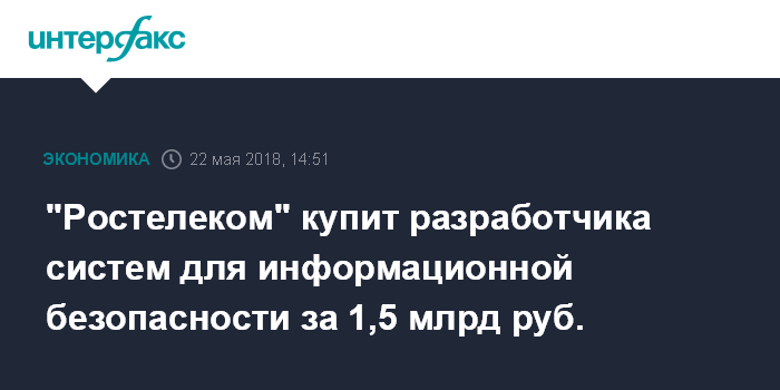 Москва. 22 мая. INTERFAX.RU - ПАО "Ростелеком" объявил о покупке 100% разработчика систем для информационной безопасности Solar Security за 1,5 млрд рублей.