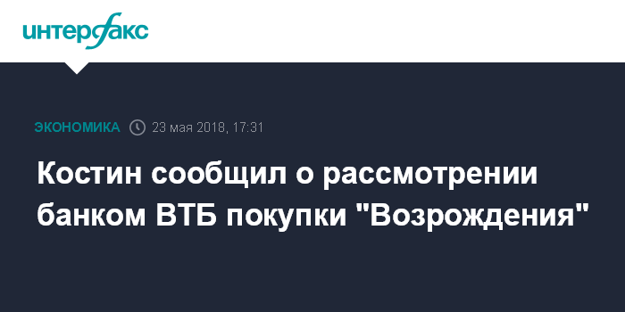 Москва. 23 мая. INTERFAX.RU - ВТБ вновь рассматривает покупку банка "Возрождение", сообщил глава ВТБ Андрей Костин на годовом собрании акционеров.