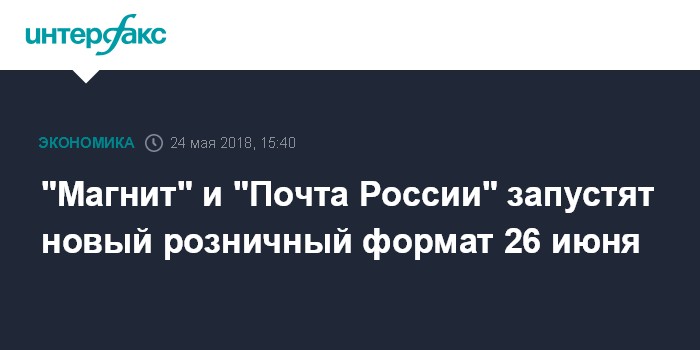 Москва. 24 мая. INTERFAX.RU - Ритейлер "Магнит" и "Почта России" объявили о планах запустить новый розничный формат в рамках сотрудничества двух компаний.