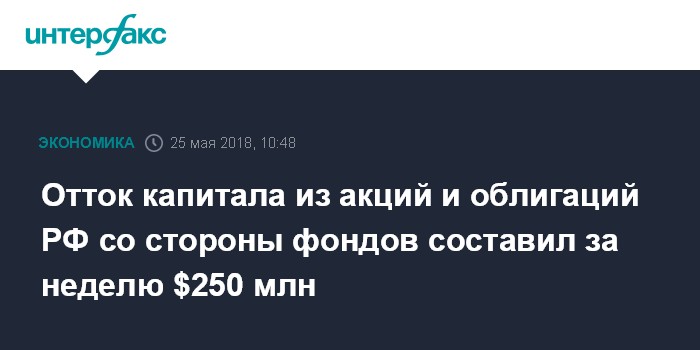 Москва. 25 мая. INTERFAX.RU - Совокупный чистый отток капитала с фондового и долгового рынка РФ со стороны фондов (с учетом всех фондов, инвестирующих в акции и облигации РФ) за неделю с 17 по 23 мая 2018 года продолжился и составил $250 млн против оттока $150 млн неделей ранее, по данным EPFR Global, говорится в обзоре главного стратега "БКС Глобал Маркетс" Вячеслава Смольянинова.