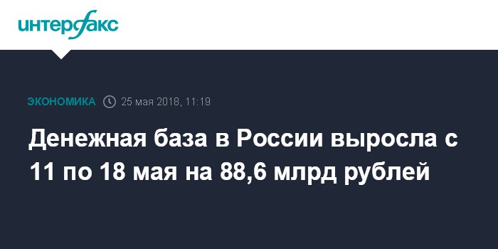 На 11 мая денежная база в России равнялась 9958,4 млрд рублей. Таким образом, за период она выросла на 88,6 млрд рублей.