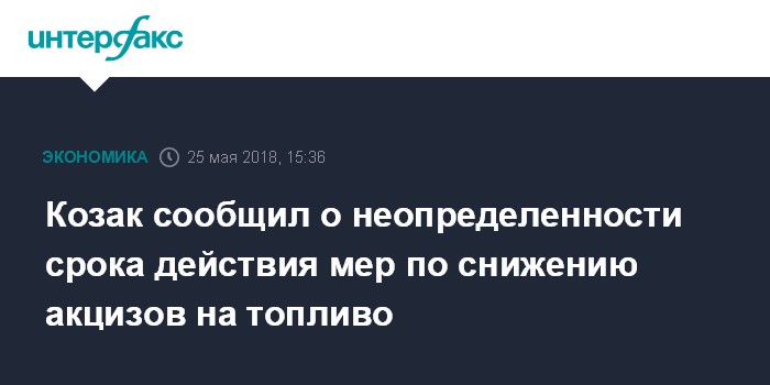 Москва. 25 мая. INTERFAX.RU - Меры по снижению акцизов на бензин на три тысячи рублей и на дизельное топливо на две тысячи рублей (с тонны от действующих ставок), вступающие в силу с 1 июля 2018 года, не имеют определенного периода действия, сообщил вице-премьер РФ Дмитрий Козак, курирующий работу промышленности, в эфире телеканала РБК.