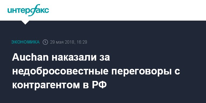 Москва. 29 мая. INTERFAX.RU - Верховный суд (ВС) РФ отказался рассмотреть кассационную жалобу российского подразделения французского ритейлера Auсhan, с которого суды взыскали убытки за "внезапное и неоправданное прекращение переговоров" с потенциальным контрагентом. Сумма присужденного равна доходам истца, которые он получил бы, не вступая в переговоры.