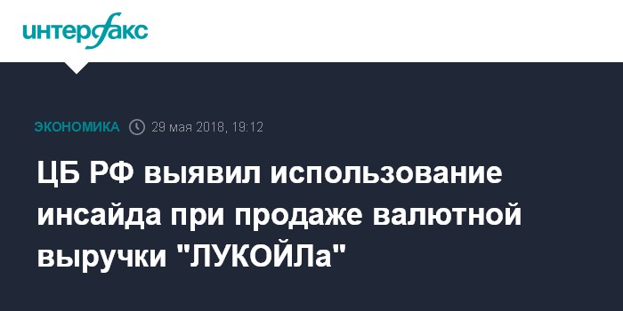 Москва. 29 мая. INTERFAX.RU - ЦБ РФ выявил неправомерное использование инсайдерской информации при осуществлении операций с валютными парами рубль/доллар (USDRUB_TOD и USDRUB_TOM) на торгах Московской биржи при продаже валютной выручки "ЛУКОЙЛа" в декабре 2015 года.