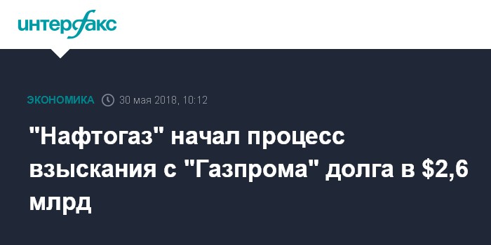 Москва. 30 мая. INTERFAX.RU - НАК "Нафтогаз Украины" начал процесс взыскания с ПАО "Газпром" долга $2,6 млрд в зарубежных судах во исполнение решения Арбитражного института Торговой палаты Стокгольма, сообщил агентству "Интерфакс" источник в украинском правительстве.