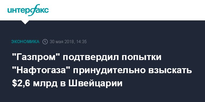 Москва. 30 мая. INTERFAX.RU - "Газпром" подтвердил, что "Нафтогаз Украины" пытается принудительно взыскать $2,6 млрд в Швейцарии.